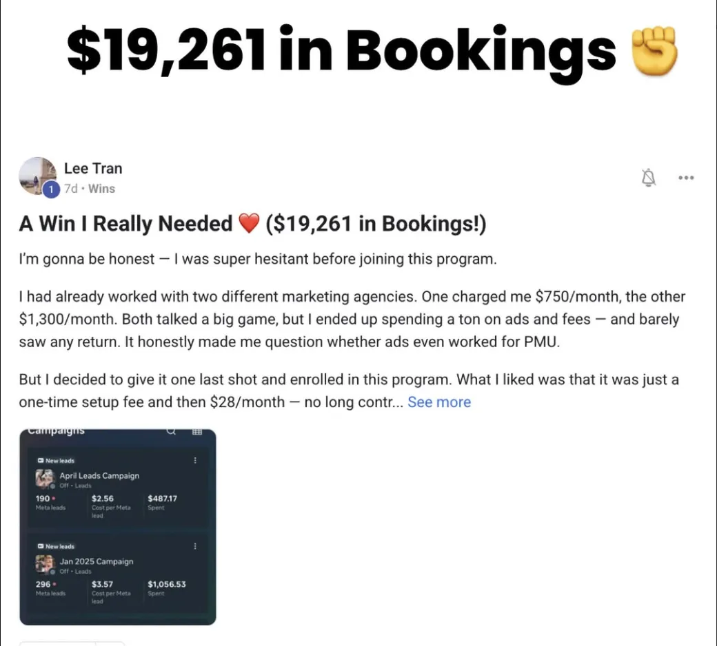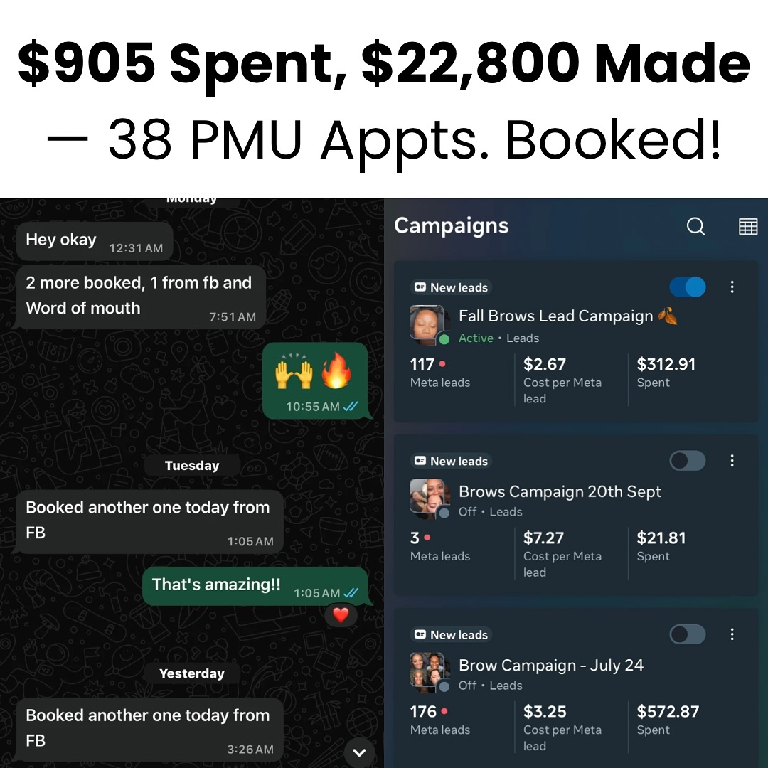 We use a proven ad + funnel system designed specifically for PMU clinics to convert cold traffic into booked appointments.